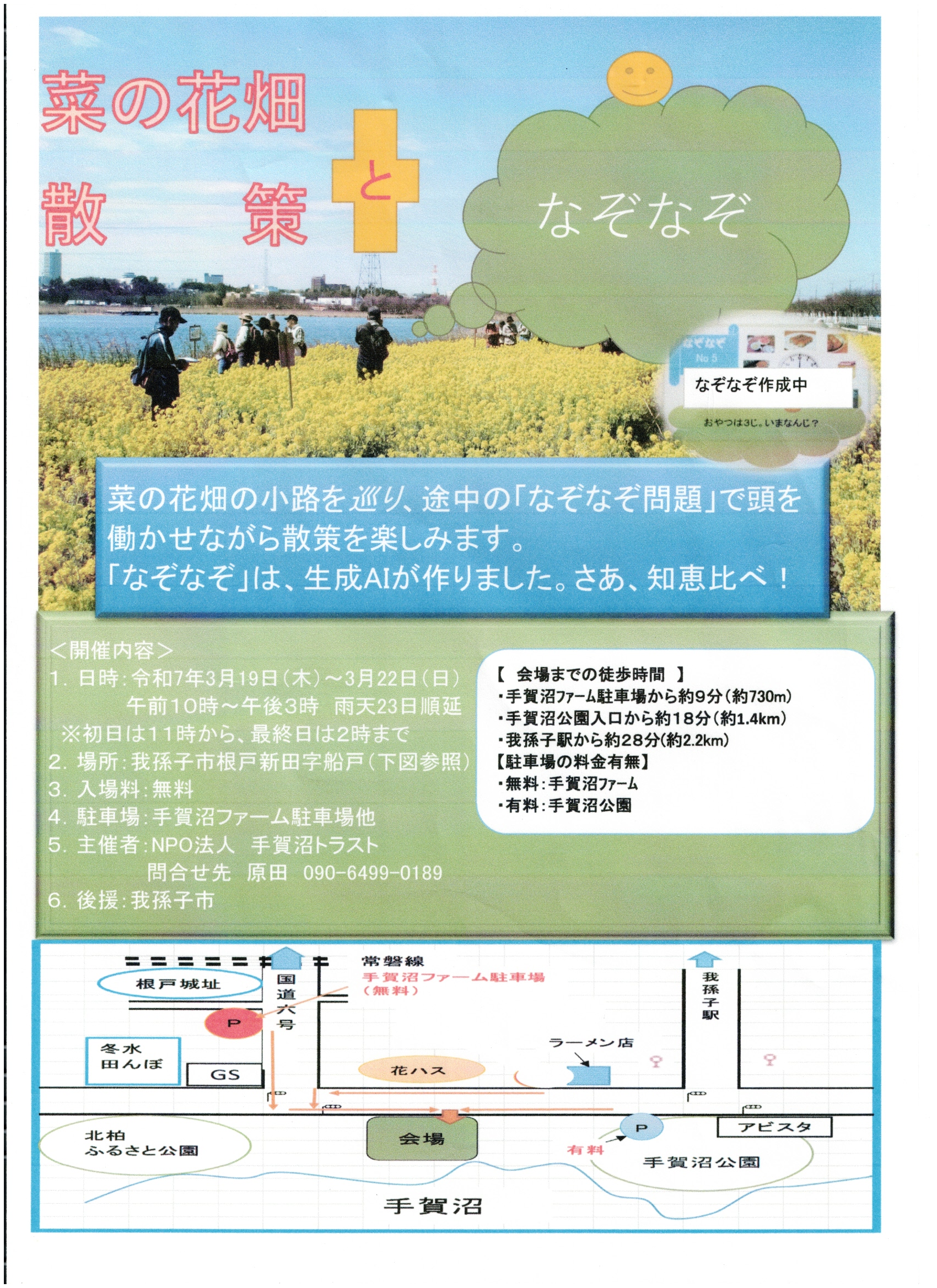 3月19日(木)~22日(日)の10:00~15:00まで、菜の花畑を解放するイベントを開催します。ぜひ、ご参加ください。詳しくはチラシをご覧ください。