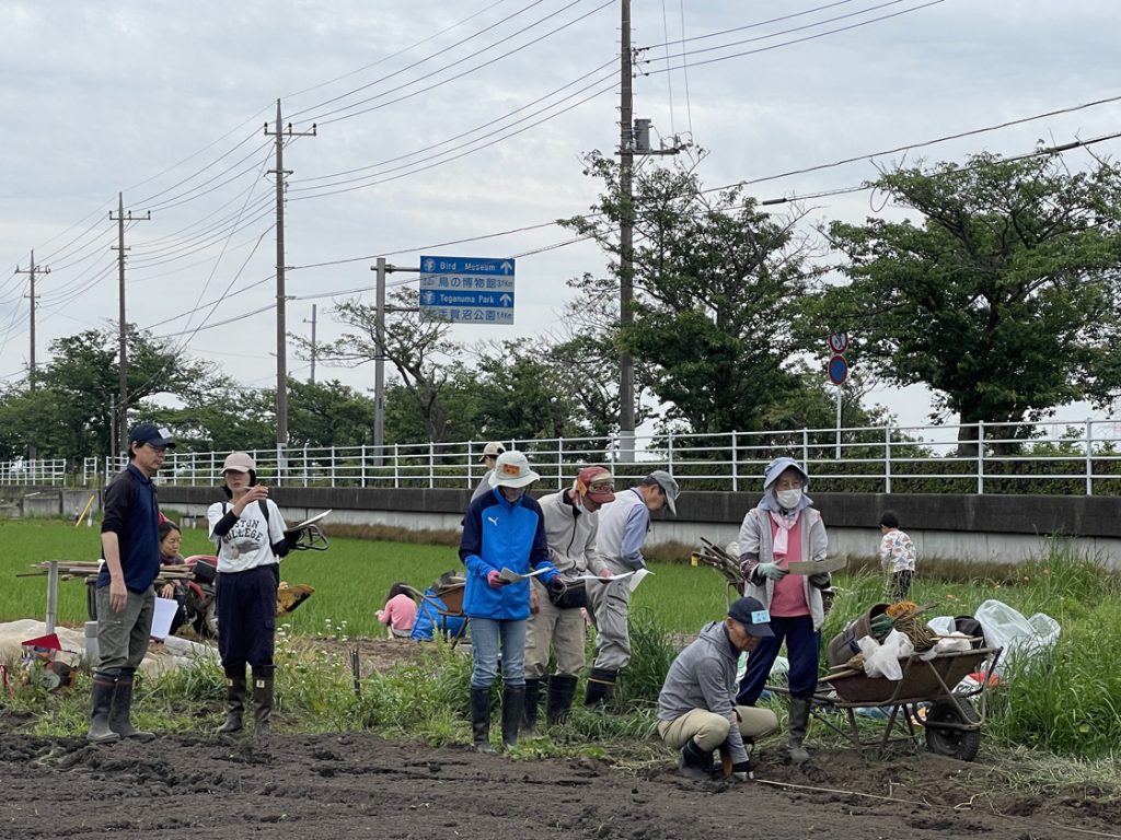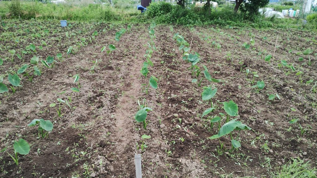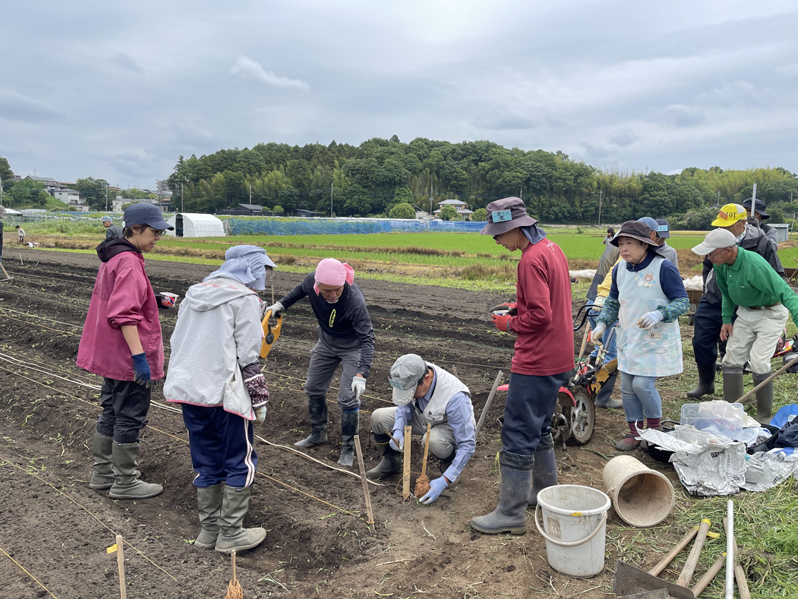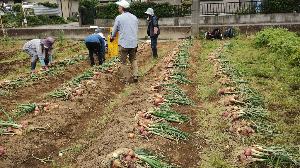 本日は、落花生の畝立てと播種(ふれあい通り圃場)、玉ねぎの収穫(みかん山下圃場)、里芋の施肥と土寄せ(みかん山下圃場)、暗渠清掃と馬糞堆肥の切返しなどを行いました。