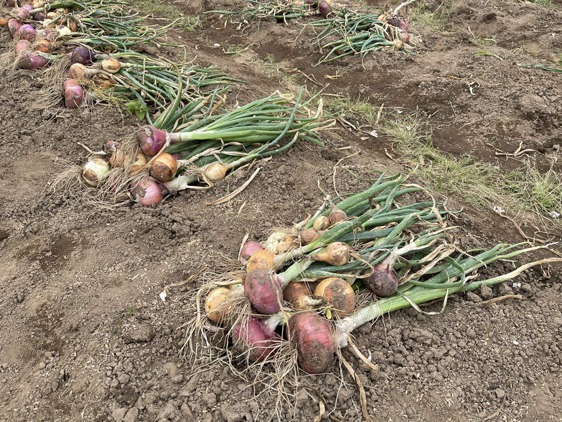 赤玉ねぎは大きく成長したものが多かったです。黄玉ねぎは赤玉ねぎに比べると小ぶりで、大小さまざまでした。同じ場所に隣どおしで植わっているのに、どうして玉ねぎの大きさが異なるのか、不思議でなりません。たくさんのお土産ができました。