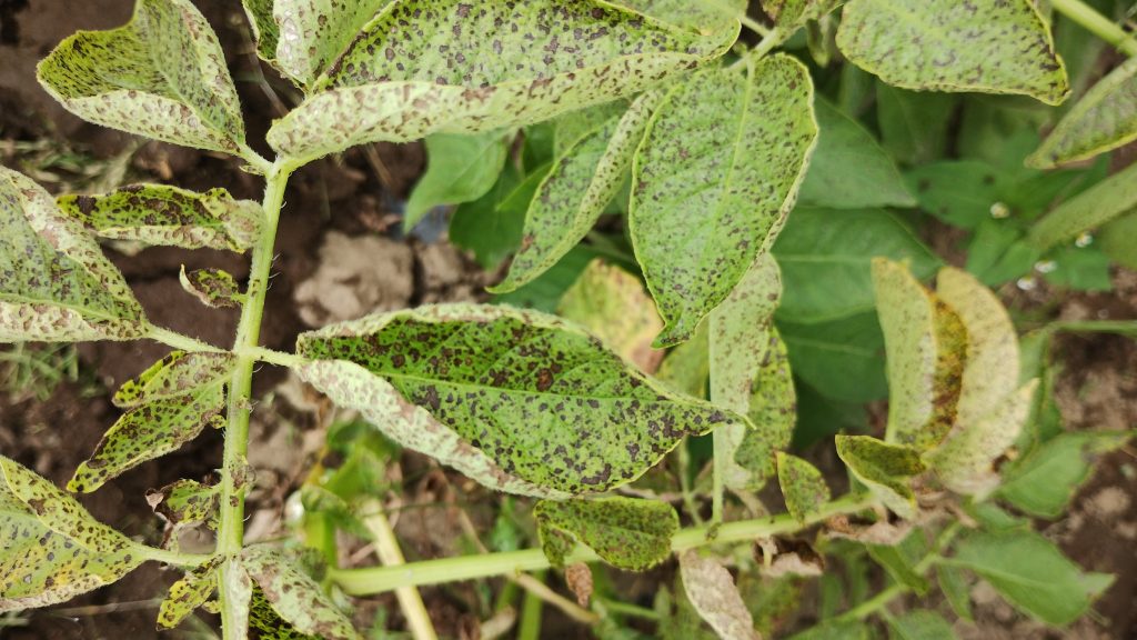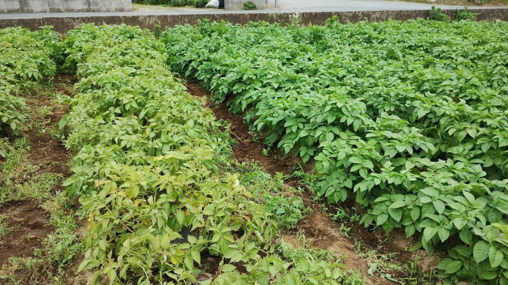 右の写真はジャガイモの葉の様子。病気にかかっているものもあります。