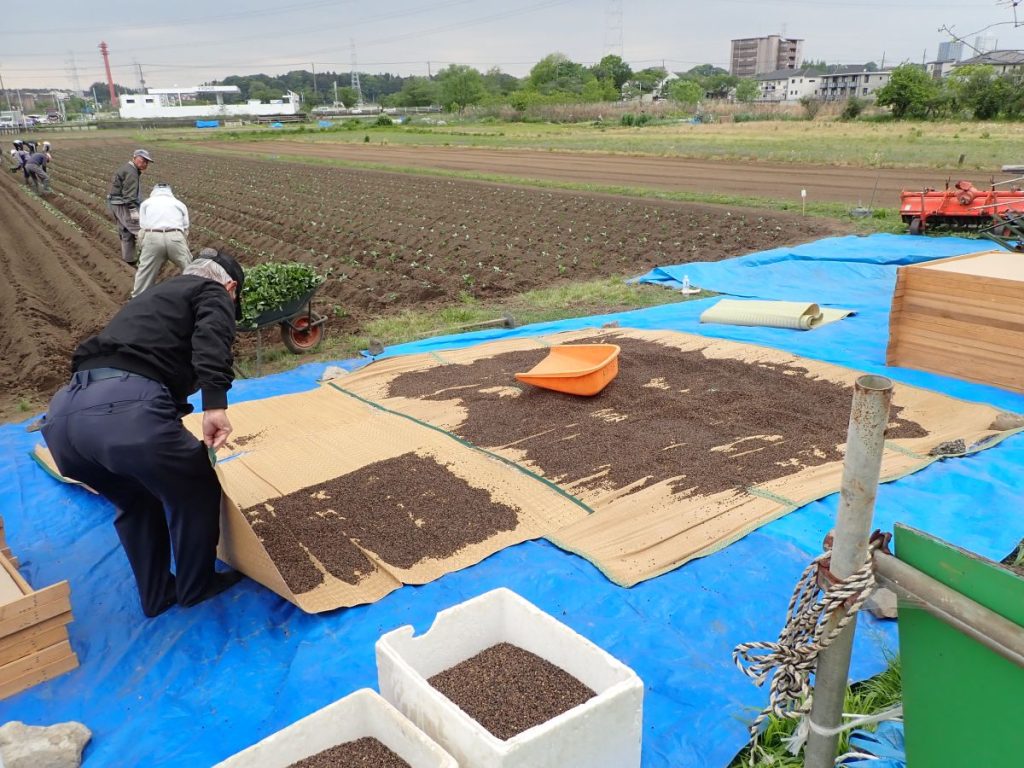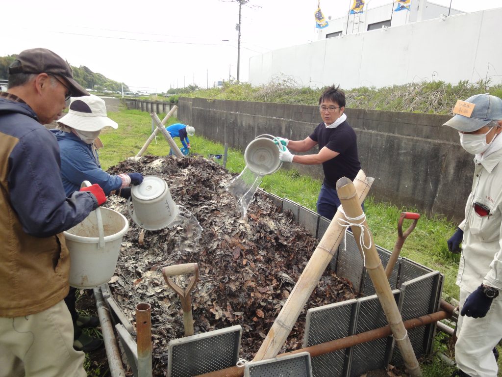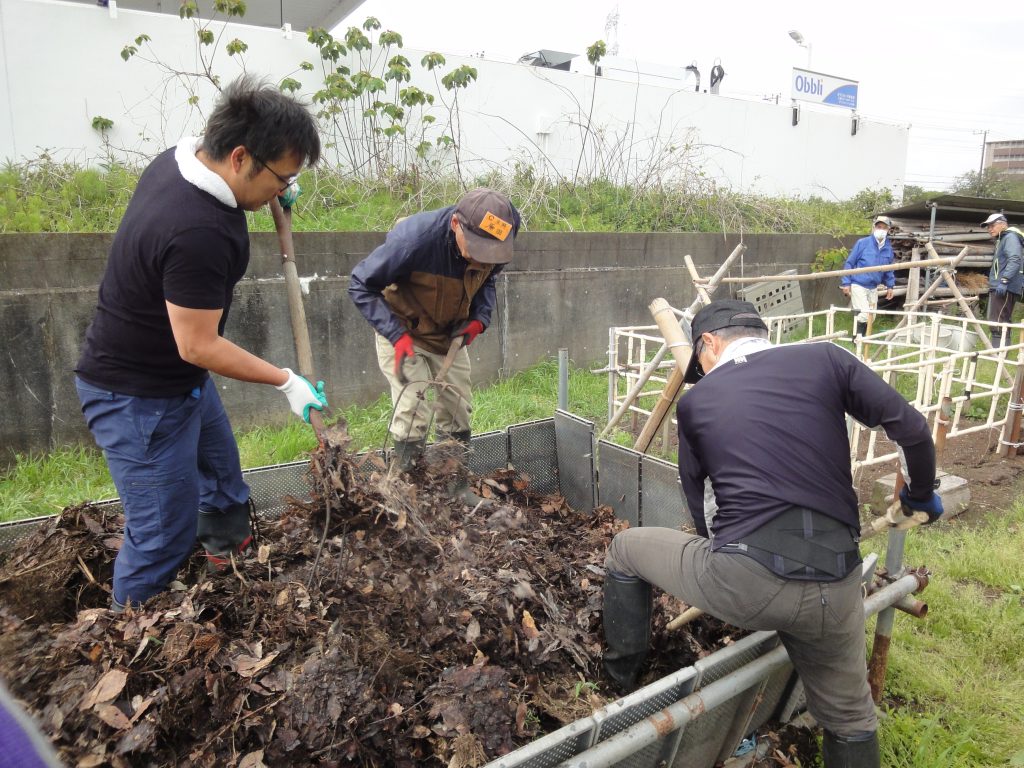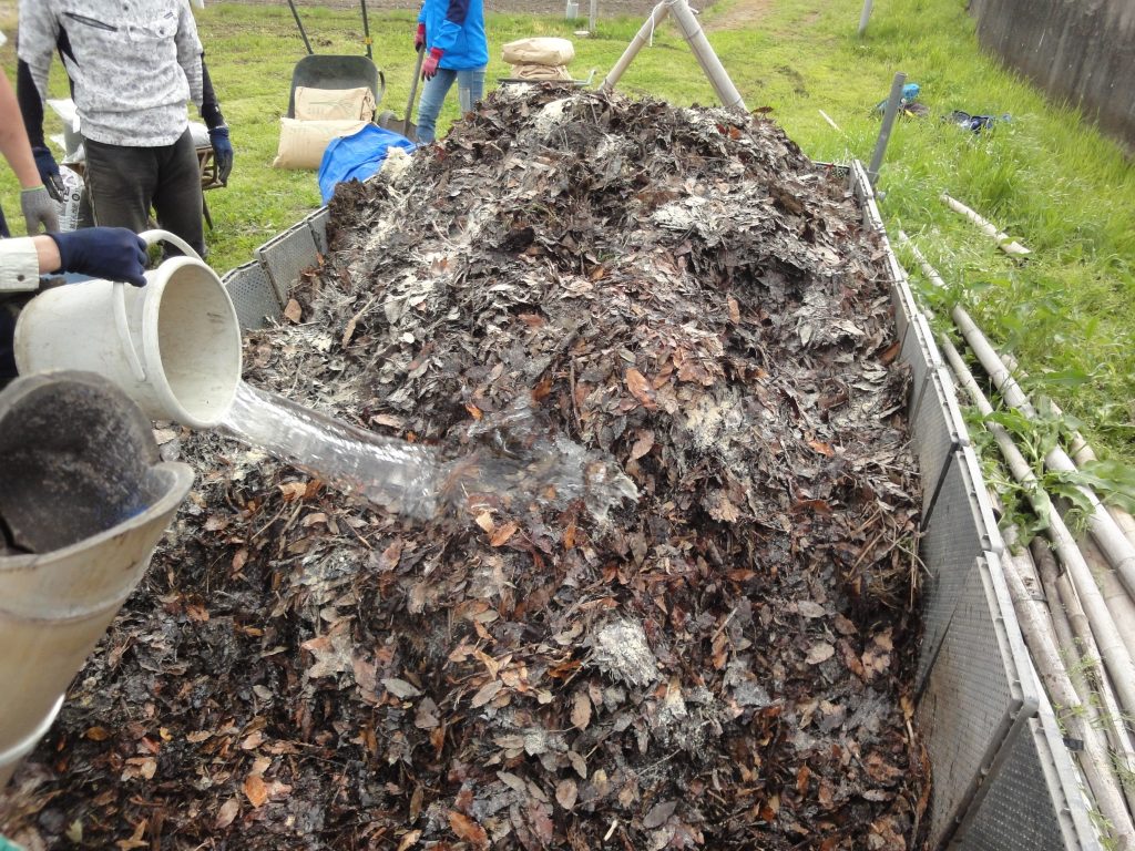 さて、今日は、すいかとかぼちゃの定植、落ち葉堆肥の切返し(1回目)、暗渠清掃と馬糞堆肥の切返し、圃場周りの除草を行いました。私は、落ち葉堆肥の切り返しに参加しましたが、落ち葉堆肥は落ち葉が積み重なってそれぞれが密着して固まっているので、剣先スコップでもずぶりとは入りません。フォークを使って切り返すのが良いのですが、フォークは先が尖っているので簡単に刺さりますが、重たくって持ち上げるのは一苦労です。まあ、そんな感じで、皆さんの協力のもと、なんとか切り返しを終了しました。切り返すというよりも、鶏糞と糠を巻きながら、また、水を加えながら、落ち葉をほぐして空気をいれるイメージですかね。