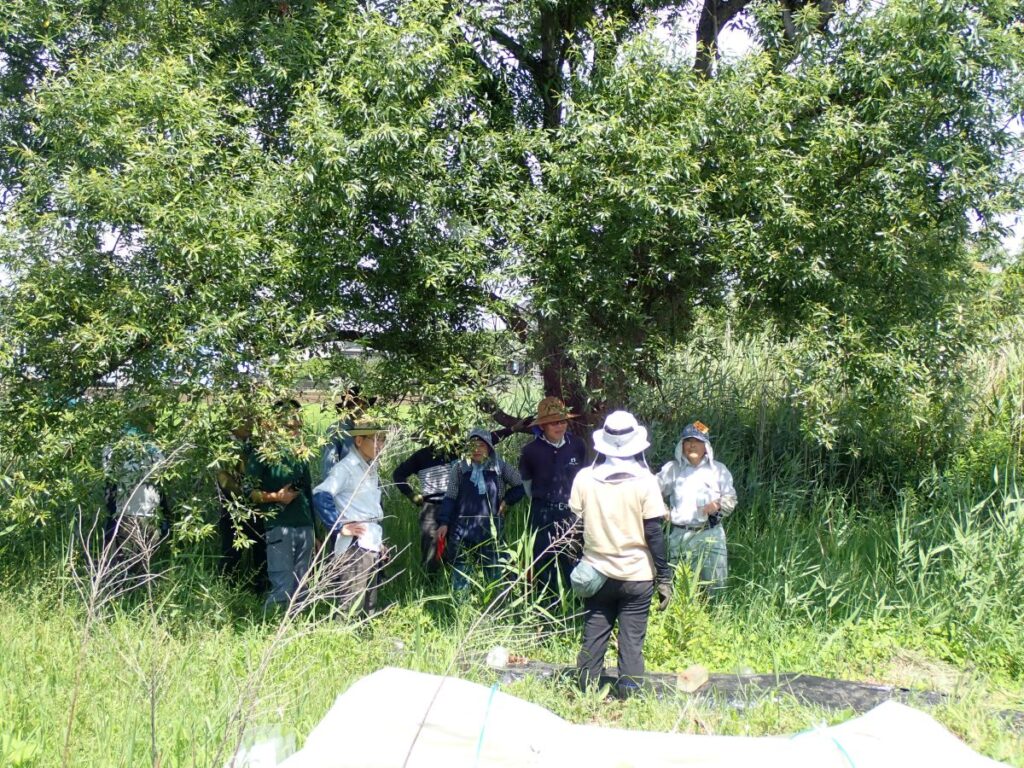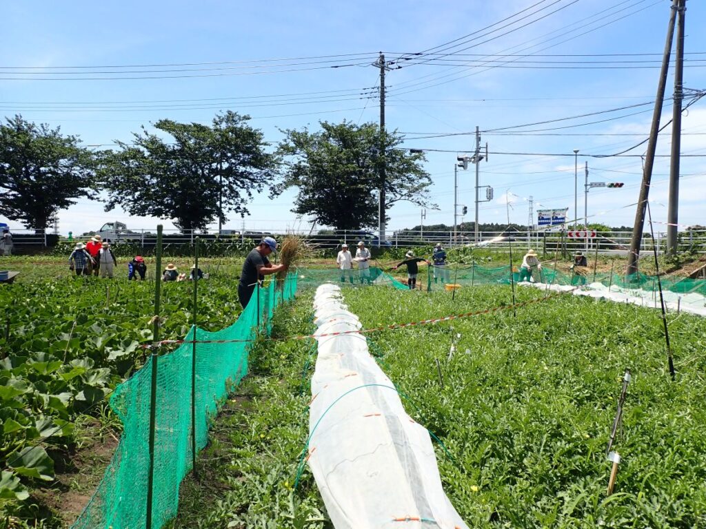 今日の作業は、ひまわり畑の除草および間引き、欠株の補植(船戸圃場、浅野第二圃場、花輪下圃場)、圃場周辺の除草(ふれあい田圃前~城址下圃場、ふれあい通り圃場、みかん山下圃場)、落花生の除草(城址下手前圃場)、枝豆の除草(ふれあい通り圃場)、かぼちゃの管理(ふれあい通り圃場)、暗渠清掃および馬糞堆肥の切返し(ふれあい田圃前)でした。皆さんお疲れ様でした。