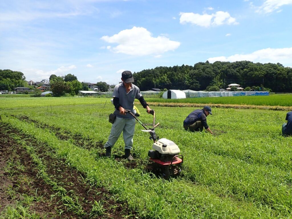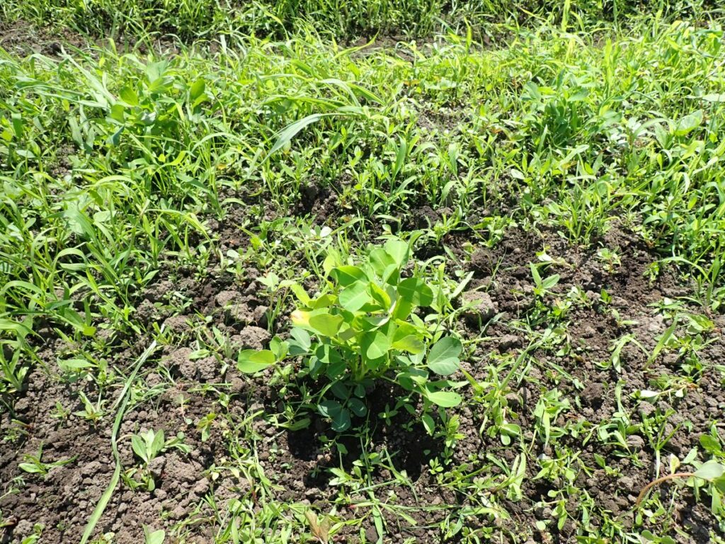 ・枝豆の除草風景 雑草がきれいに生え揃っています。たいへん。