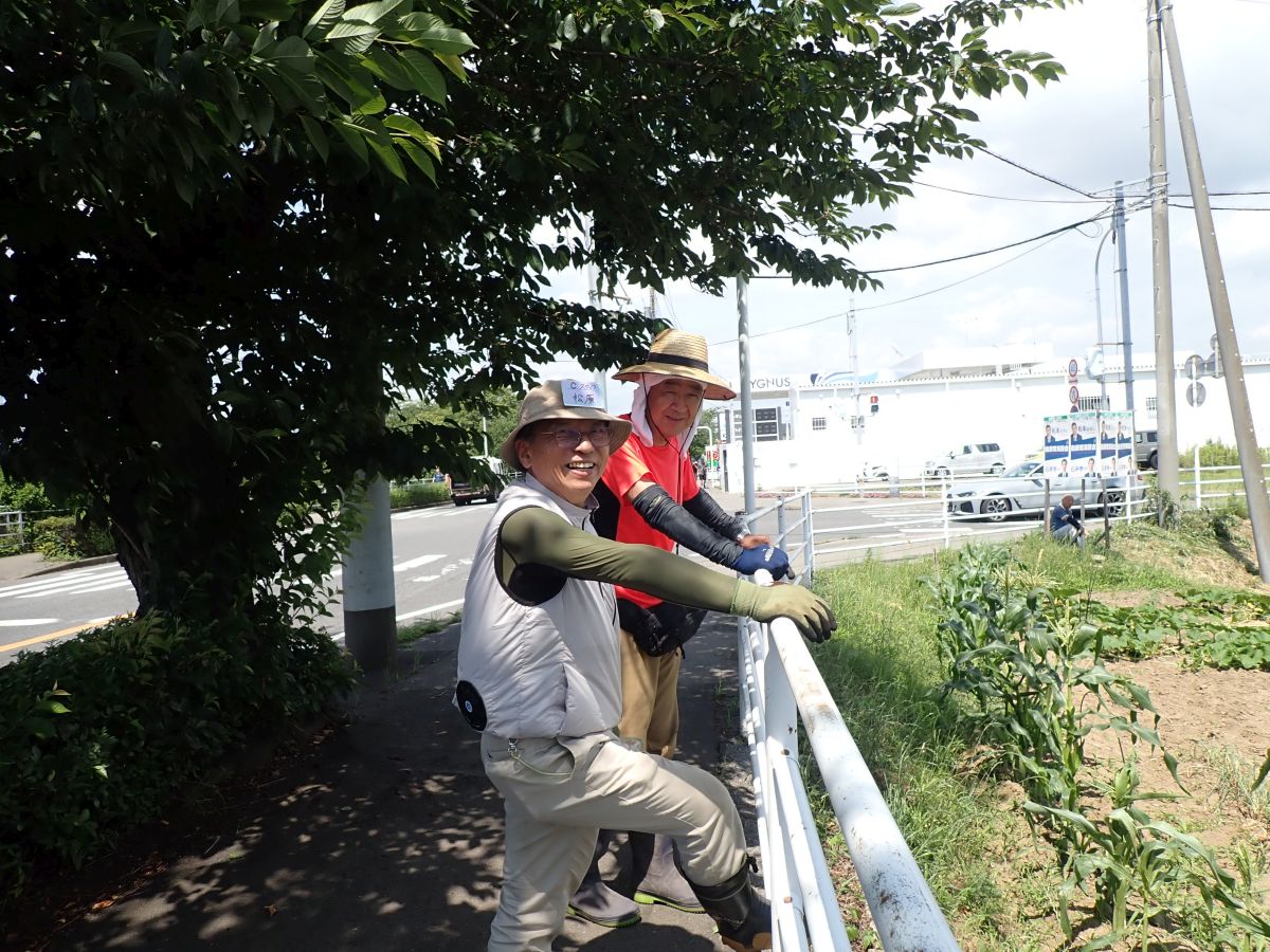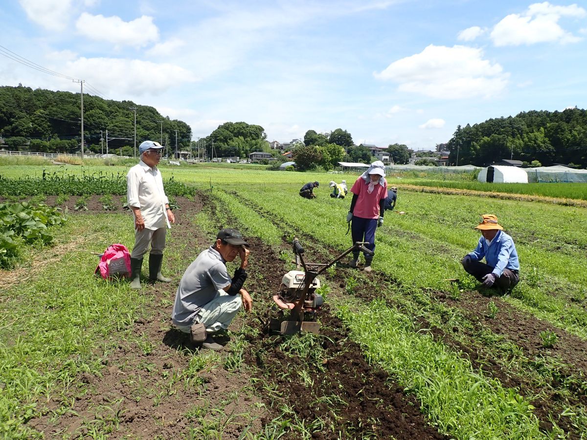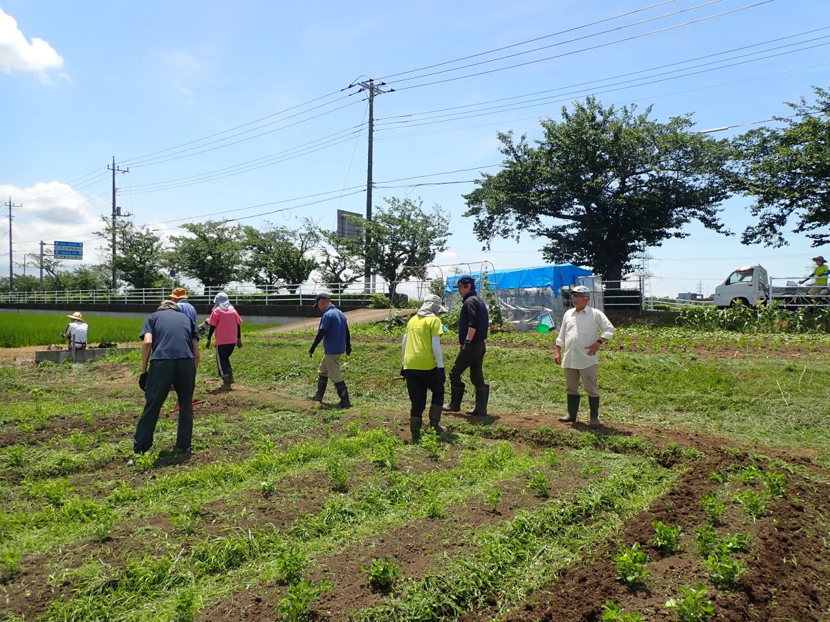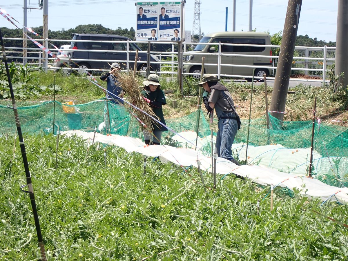 今日の作業は、ひまわり畑の除草および間引き、欠株の補植(船戸圃場、浅野第二圃場、花輪下圃場)、圃場周辺の除草(ふれあい田圃前~城址下圃場、ふれあい通り圃場、みかん山下圃場)、落花生の除草(城址下手前圃場)、枝豆の除草(ふれあい通り圃場)、かぼちゃの管理(ふれあい通り圃場)、暗渠清掃および馬糞堆肥の切返し(ふれあい田圃前)でした。皆さんお疲れ様でした。