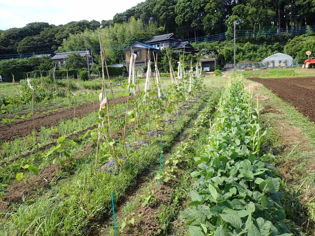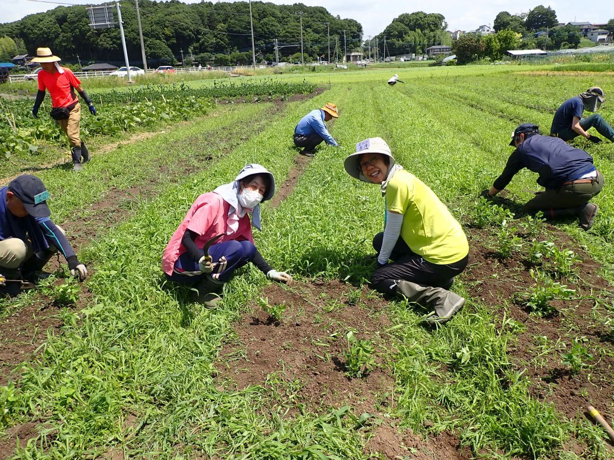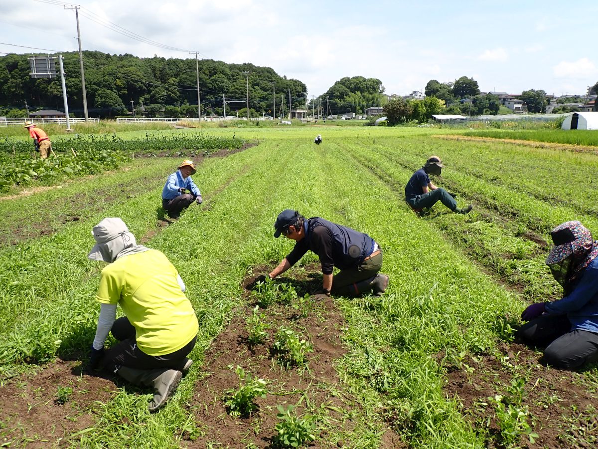 ・枝豆の除草風景 雑草がきれいに生え揃っています。たいへん。