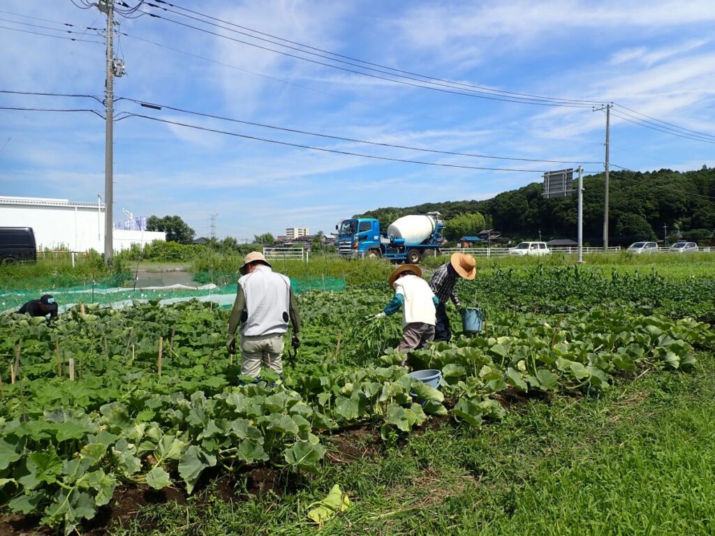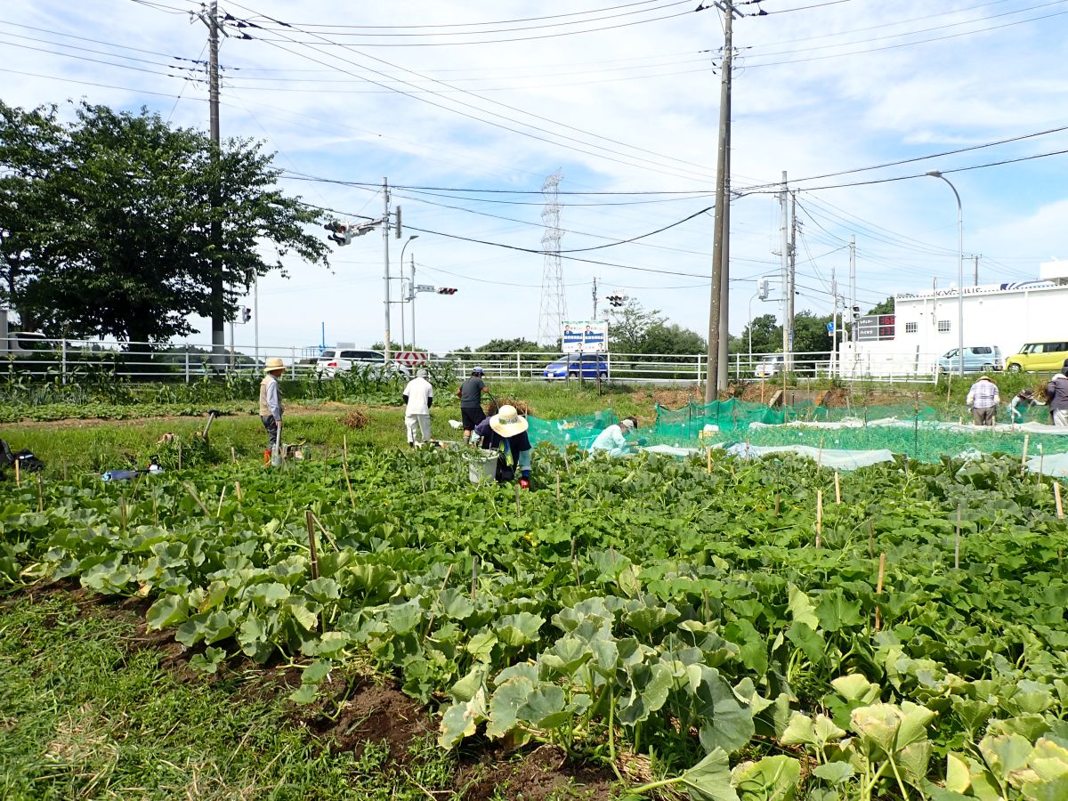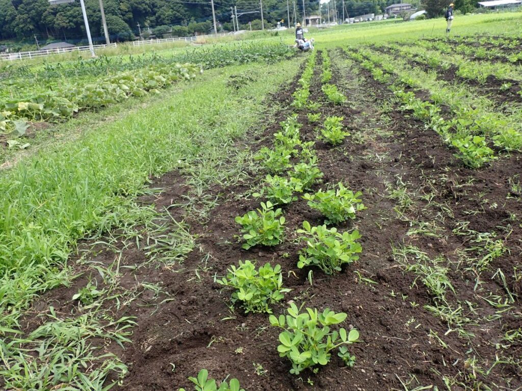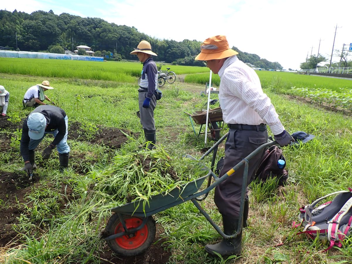 今日は、落花生の除草(ふれあい通り圃場)、里芋の土寄せ・除草(みかん山下圃場)、馬糞堆肥の切返し(2回目)(ふれあい田圃前)、暗渠の清掃(ふれあい田圃前)、スイカ・カボチャの管理を実施しました。雑草が生い茂っていたラッカセイ畑の除草は大勢の協力のもと、何とか終えることができました。ラッカセイは来年からは黒マルチを敷いたほうがよいという話題もありました。