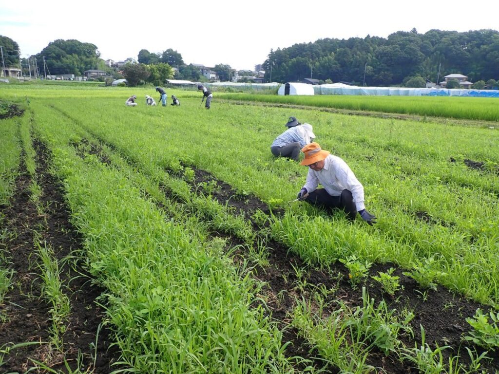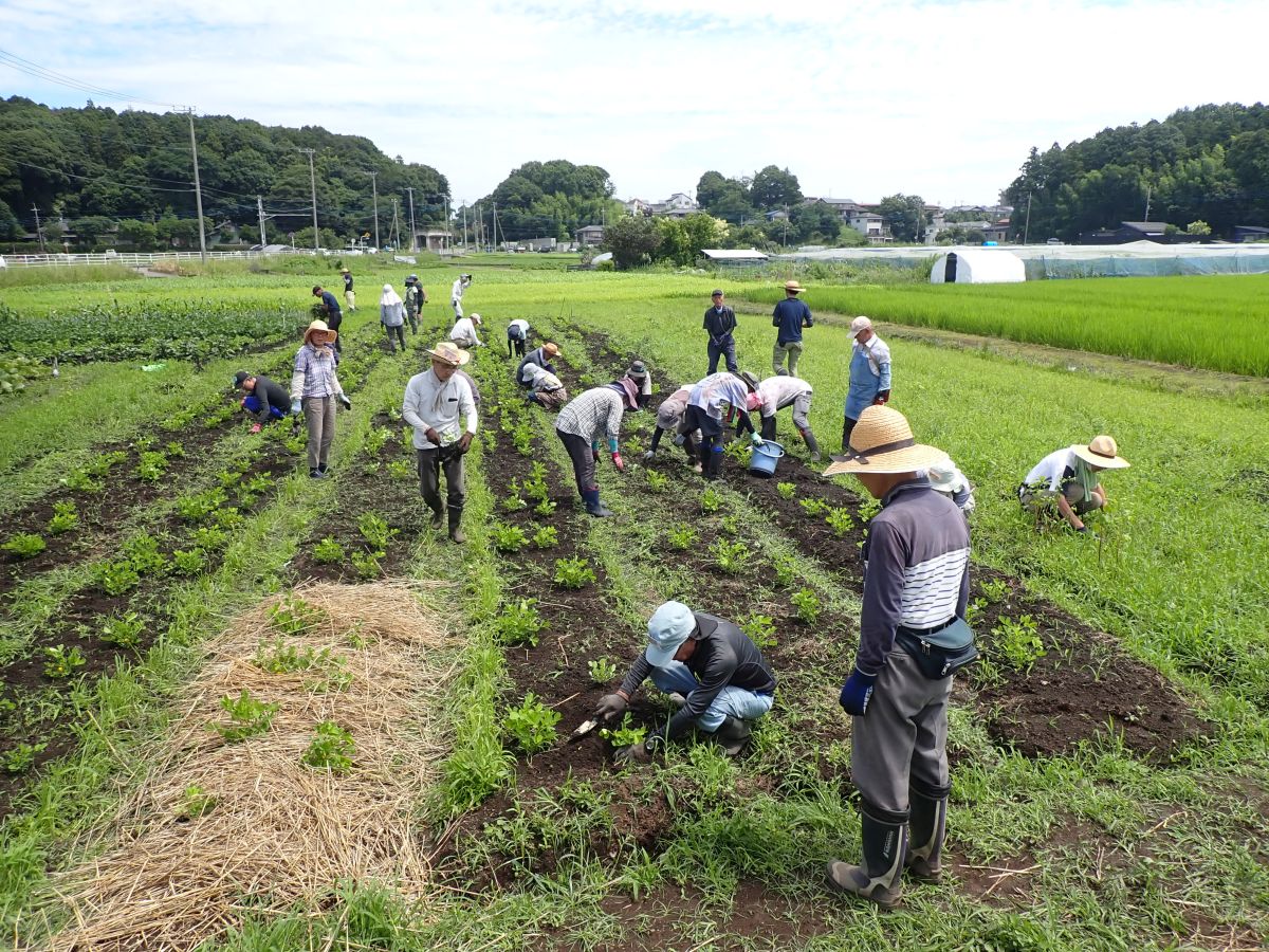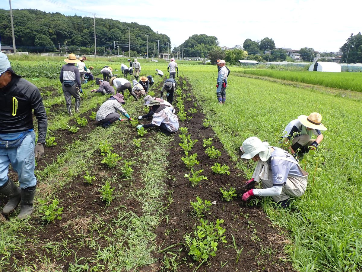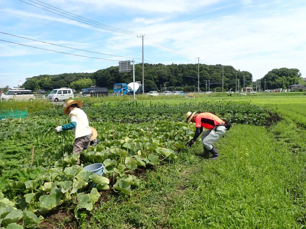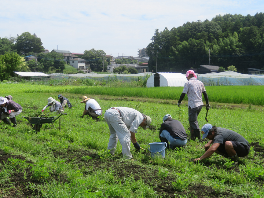 今日は、落花生の除草(ふれあい通り圃場)、里芋の土寄せ・除草(みかん山下圃場)、馬糞堆肥の切返し(2回目)(ふれあい田圃前)、暗渠の清掃(ふれあい田圃前)、スイカ・カボチャの管理を実施しました。雑草が生い茂っていたラッカセイ畑の除草は大勢の協力のもと、何とか終えることができました。ラッカセイは来年からは黒マルチを敷いたほうがよいという話題もありました。