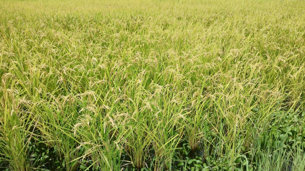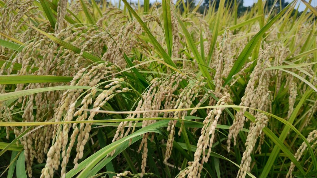 稲穂が大きく実っています。9月には収穫です。