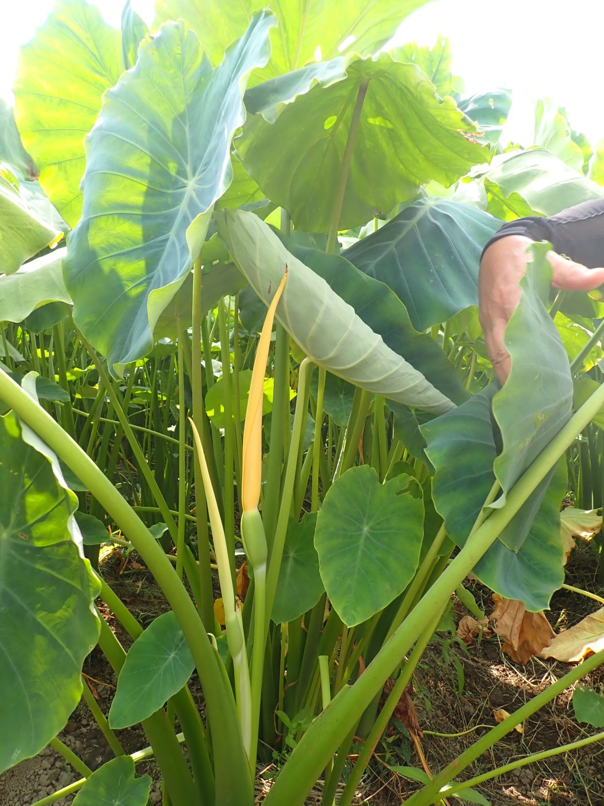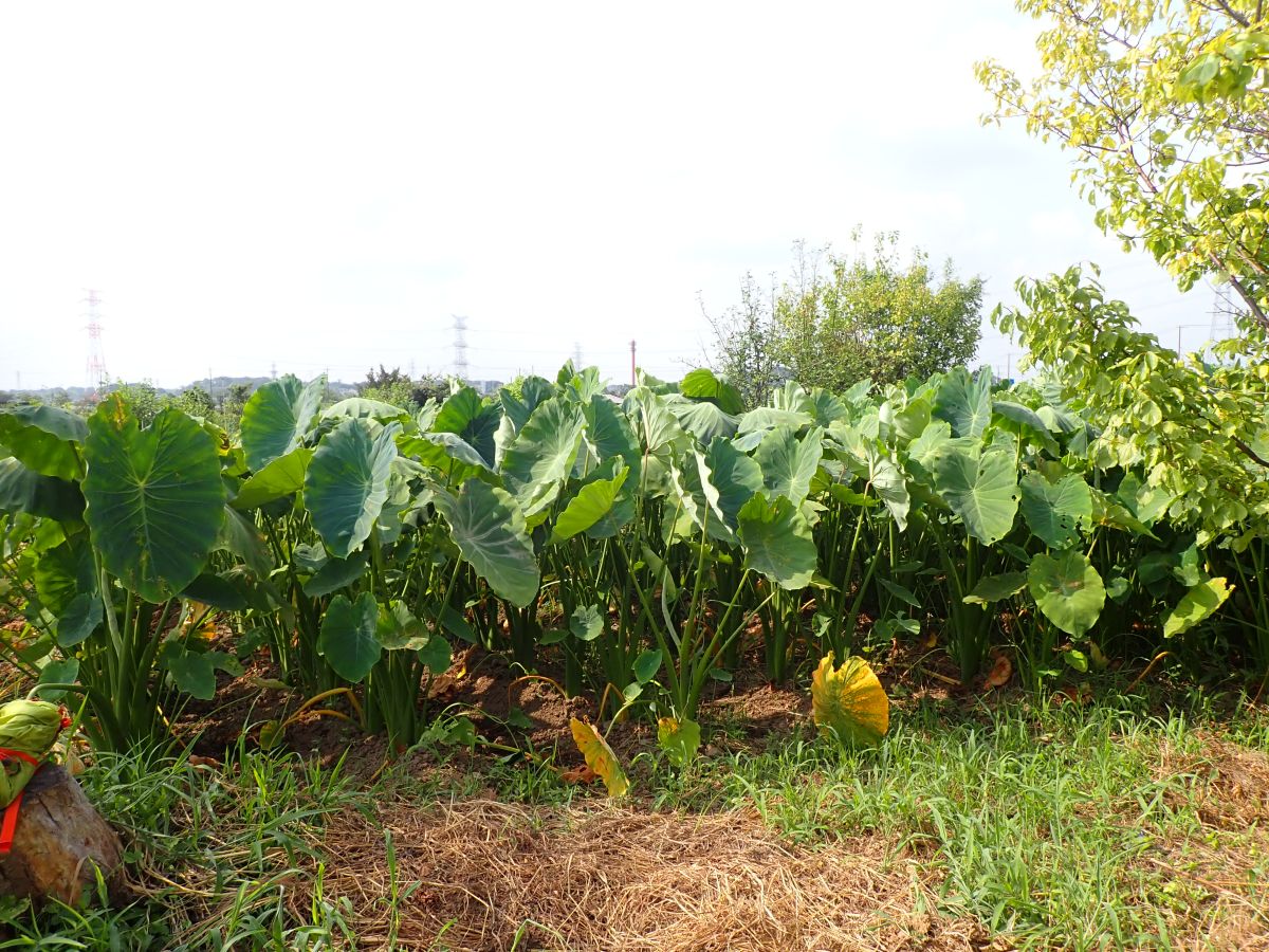 里芋に花が咲きました。葉っぱも大きく成長しています。