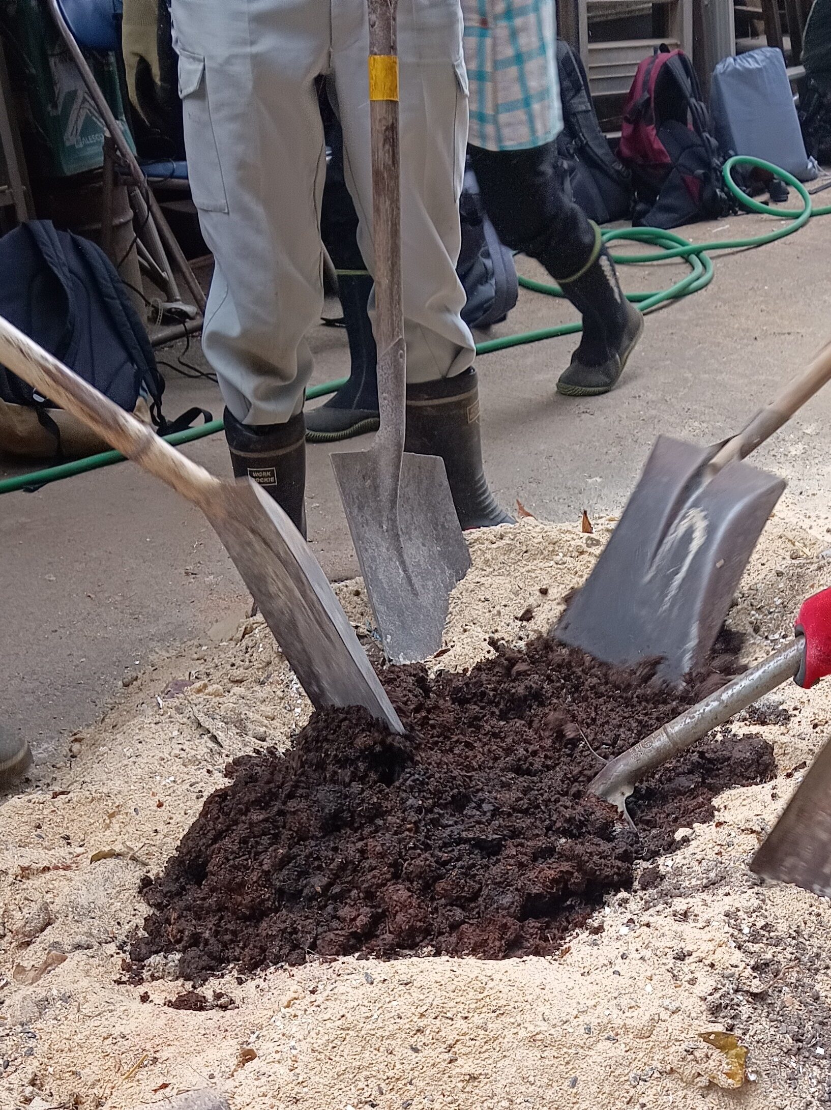 1年次生 ボカシ肥づくりに挑戦しました。コーヒー豆の出し殻、卵の殻、糠、くず米などを混ぜて、スコップでよく撹拌します。水の量が大事で、握って丁度崩れない程度の含水比が求められます。