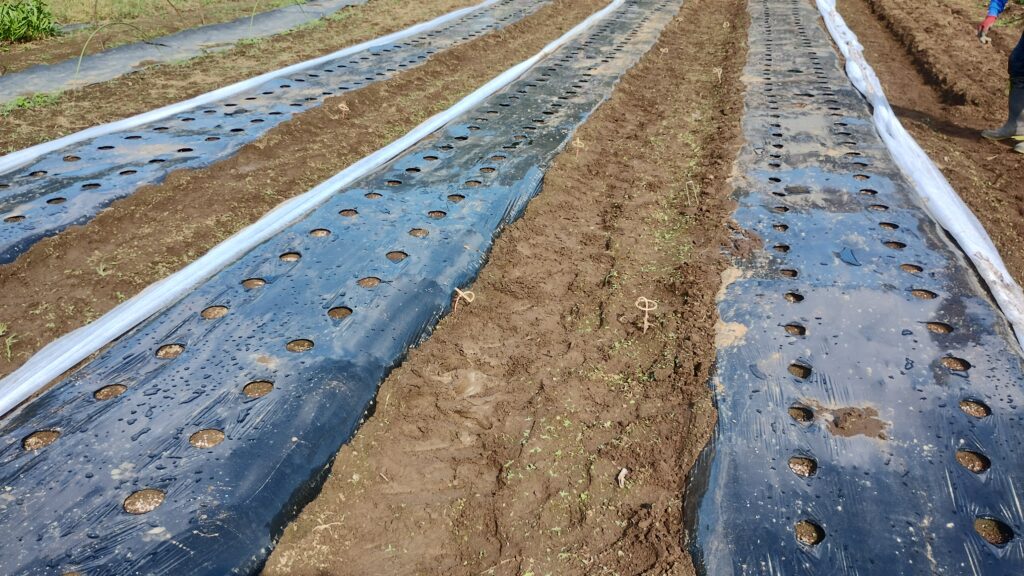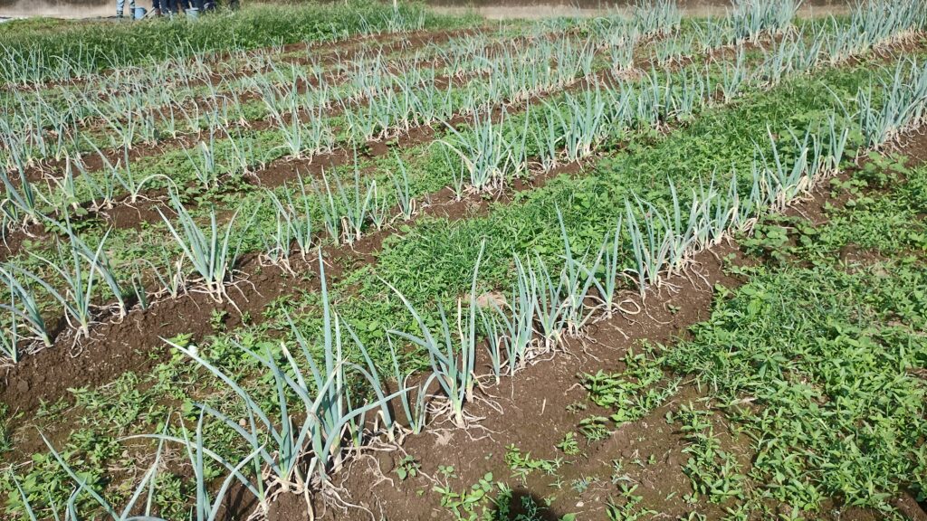今日の作業は、玉ねぎ・にんにくの畝立て、菜の花(景観作物)の元肥施肥、ぼかし肥の切返し、暗渠清掃と馬糞堆肥の切返し、レタスの追加播種、ニンジンの管理でした。