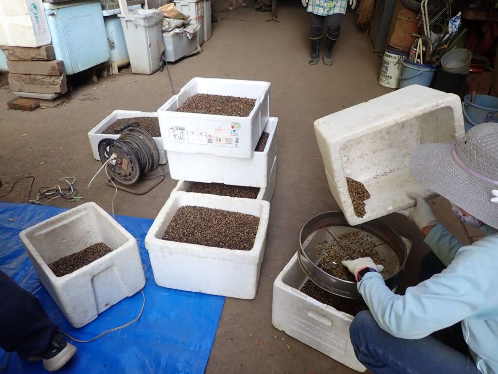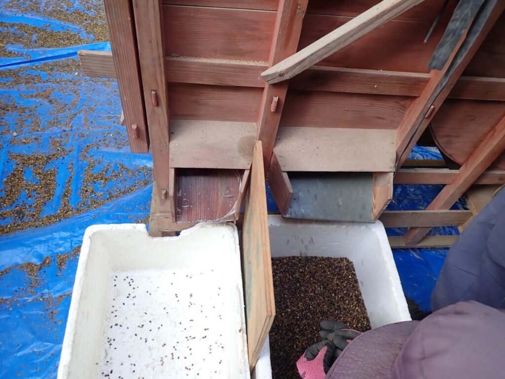11/3にそば刈をしましたが、天日干ししたそばの実を唐箕(とうみ)がけしています