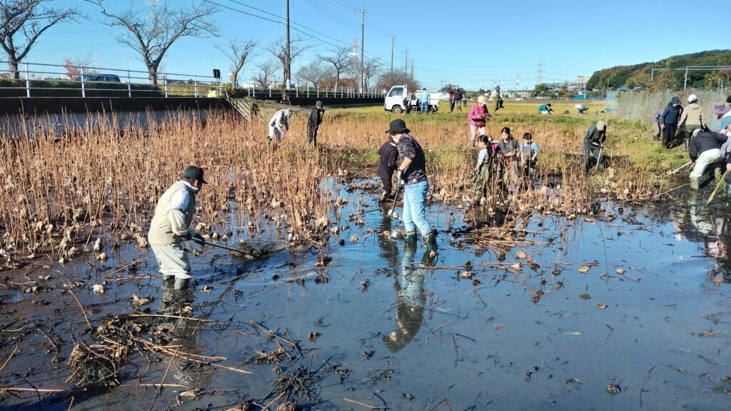 今日の作業は、花蓮池の整備、たまねぎの定植、暗渠清掃と馬糞堆肥の切り返し、そば祭りの準備、だいこんの収穫を行いました。