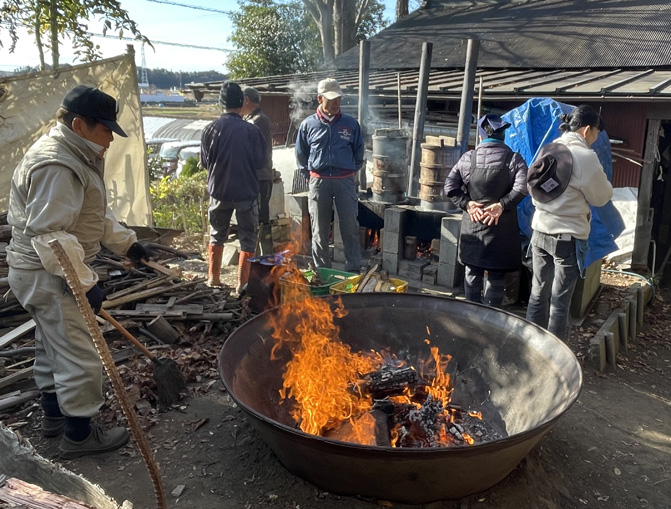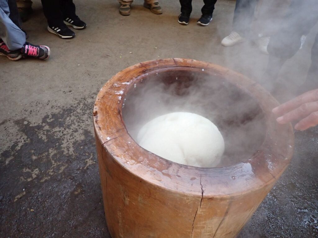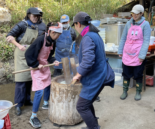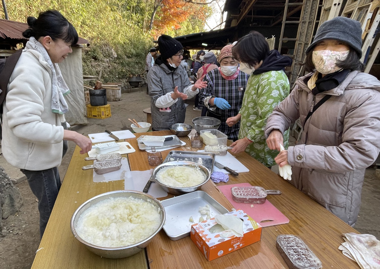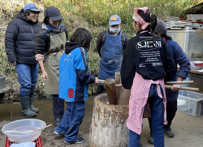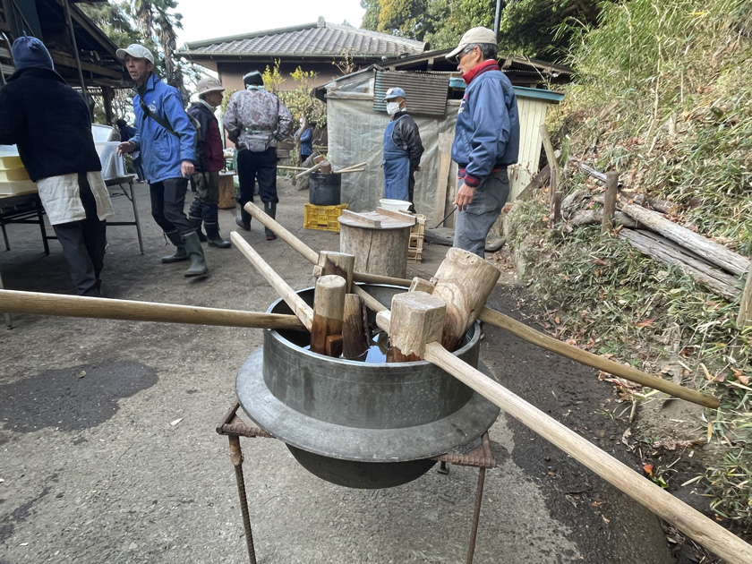 火を起こして、かまどでお米を蒸して、いよいよ餅つきです。
